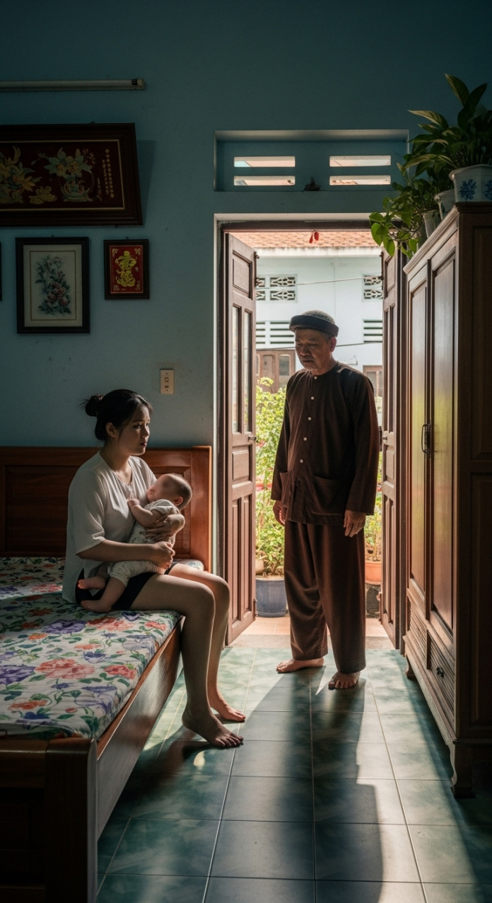 Tối hôm đó, khi tôi đang ngồi cho con bú trong phòng, ông bất ngờ đẩy cửa bước vào, không hề gõ. Ánh mắt ông nhìn chằm chằm vào tôi, vào đứa trẻ đang ngậm bầu ngực, khiến toàn thân tôi nổi da gà. Tôi vội kéo khăn che lại, hốt hoảng nói: