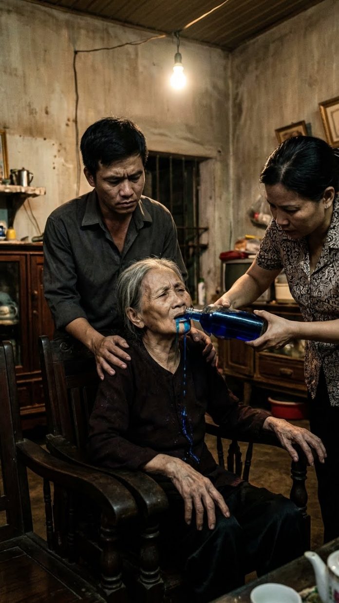 “Uống đi, bà già vô dụng! Rụng sạch sẽ đi!” Lan gằn giọng, rồi thành bột, đổ dòng nước muối lạnh vào miệng bà.
