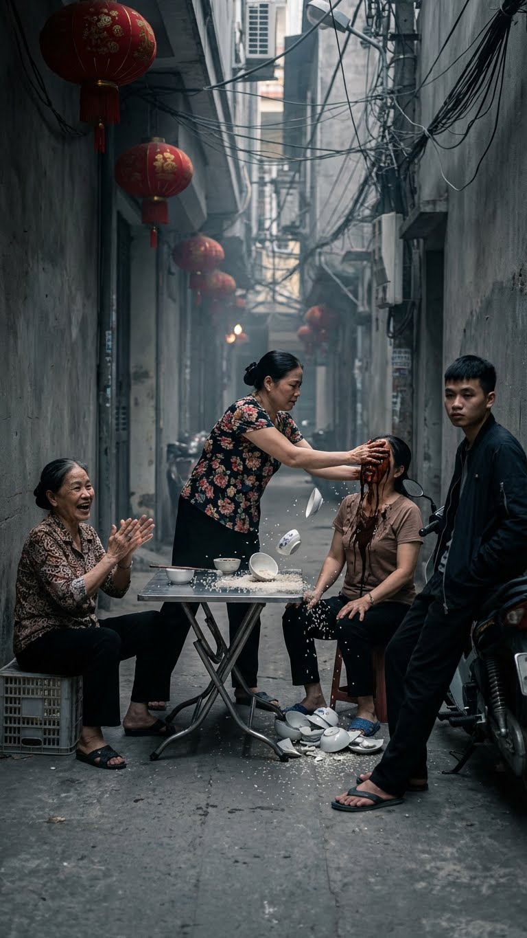 Hùng – chồng tôi – ngồi im. Anh ta chỉ liếc tôi một cái rồi cúi xuống tiếp tục ăn, như thể chuyện vừa xảy ra là bình thường.