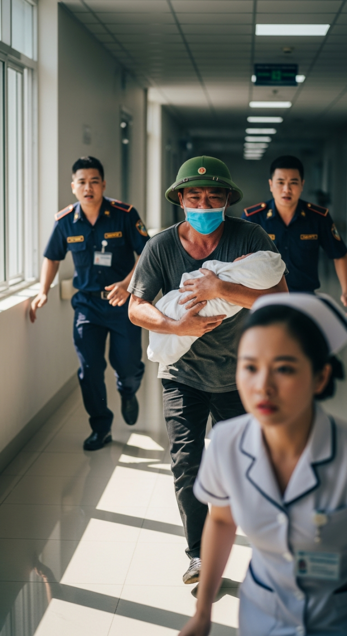Tiếng giày bảo vệ dồn dập vang lên. Thảo đứng chắn lối, tay giơ cao như ra hiệu: “Bác dừng lại! Đặt bé xuống!”