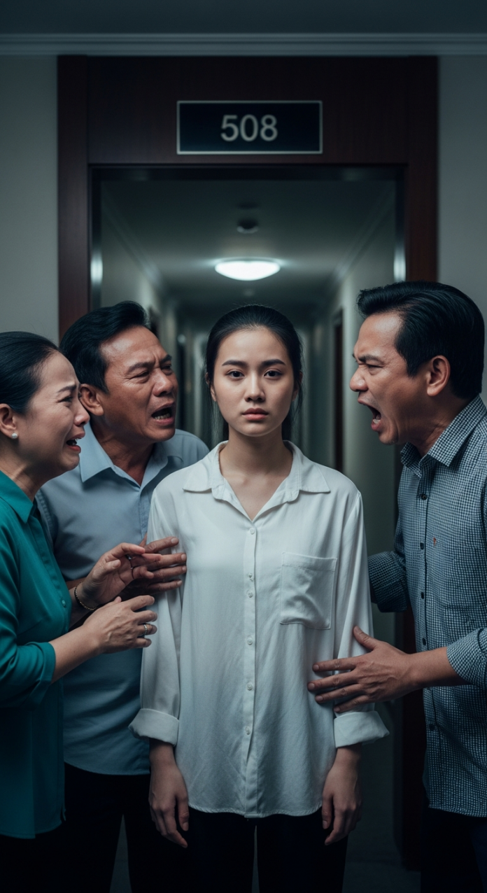 Mẹ chồng tôi mặt tái mét. Ba chồng đi phía sau, ánh mắt giận dữ. Bên kia là một người phụ nữ trung niên run rẩy, theo sau là chồng bà. Họ đứng trước cửa phòng 508, nhìn nhau, rồi nhìn tôi.