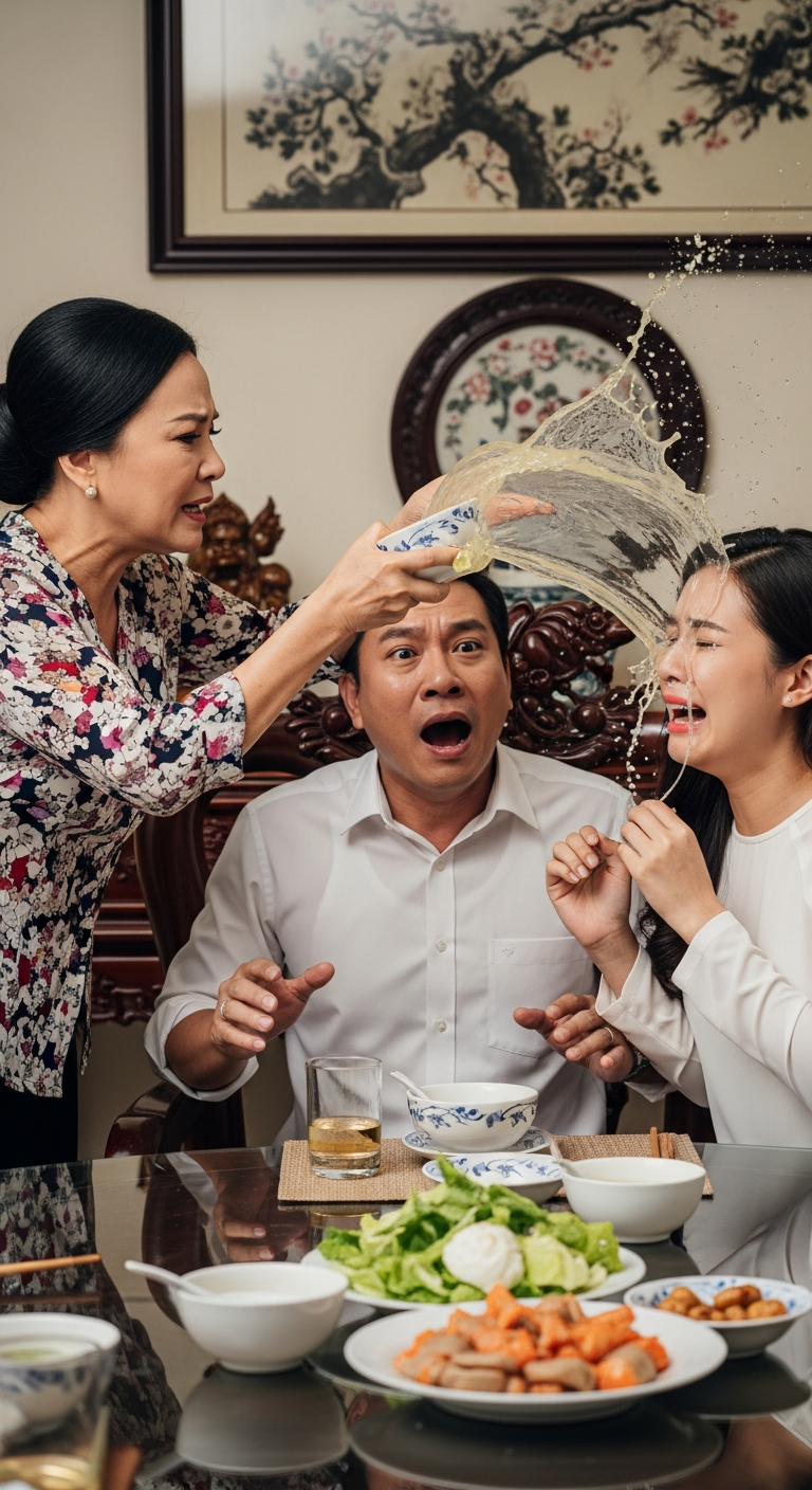 Tôi còn chưa kịp hiểu “thứ người” là thứ gì thì bà bưng tô canh trước mặt, hất thẳng. Nước canh nóng tạt vào má, chảy xuống cổ, mùi hành tiêu bốc lên cay xè. Tôi chết sững, bàn tay run đến mức không lau nổi. Bà đứng bật dậy, chỉ thẳng:
