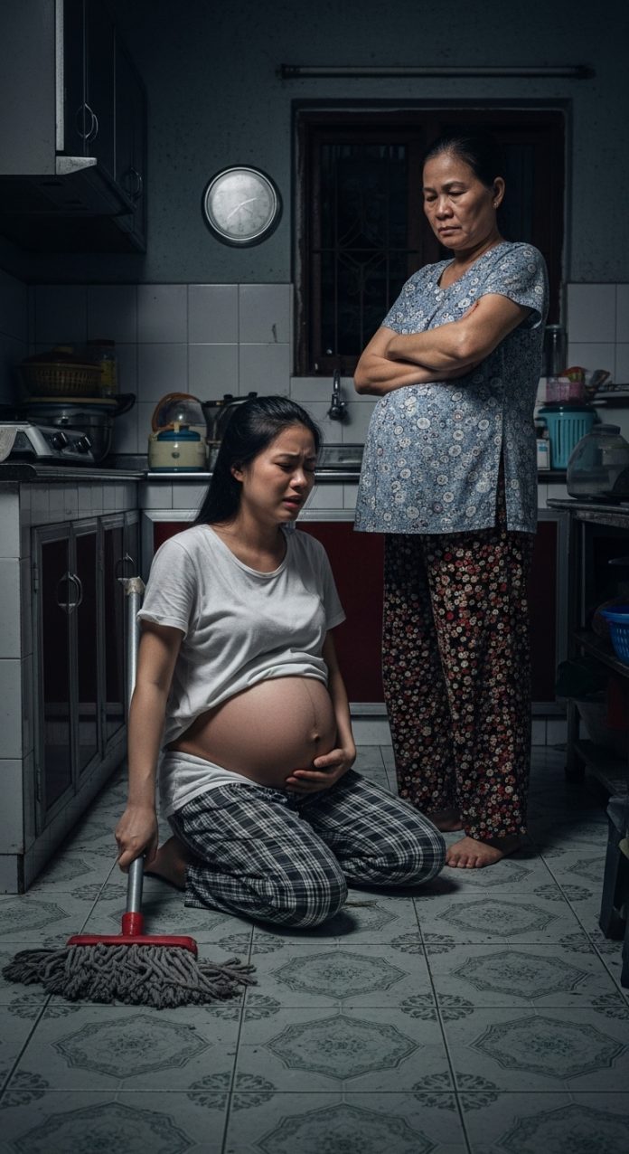 Đỉnh điểm là một tối, tôi đang dọn bồn cầu thì bà Thu gọi lớn: “Lan, lên lau sàn phòng mẹ! Mẹ buồn nôn, chịu không nổi mùi.” Tôi chạy lên, trượt chân vì nước, bụng đập vào mép giường. Cơn đau nhói lên, tôi toát mồ hôi lạnh. Tôi gọi Huy, anh lao vào nhưng không đỡ tôi trước—anh đỡ mẹ trước, hỏi: “Mẹ có sao không?”