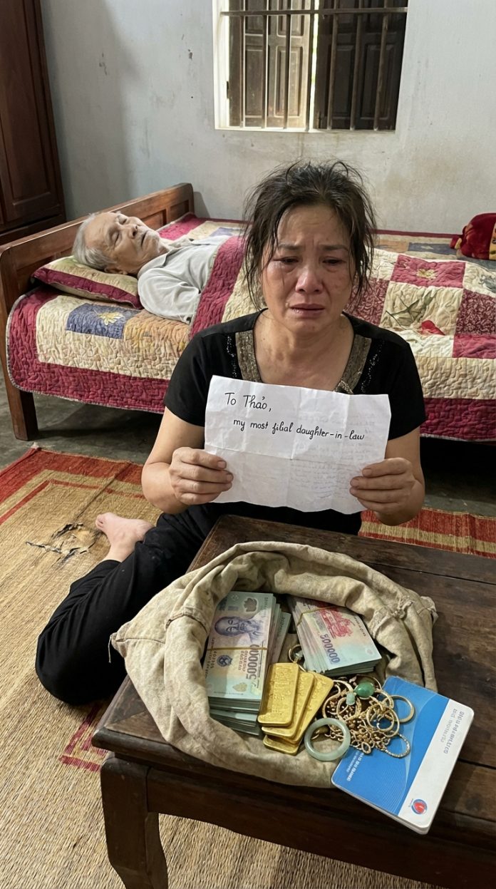 Kèm theo đó, là một mảnh giấy ông viết run rẩy: “Con là đứa con dâu hiếu thảo nhất đời bố. Bố không có gì quý giá, chỉ mong chút này giúp con vơi bớt nhọc nhằn. Đừng trách các anh chị của chồng con, vì bố muốn trao riêng cho con – người đã ở bên chăm sóc bố suốt 12 năm trời.”