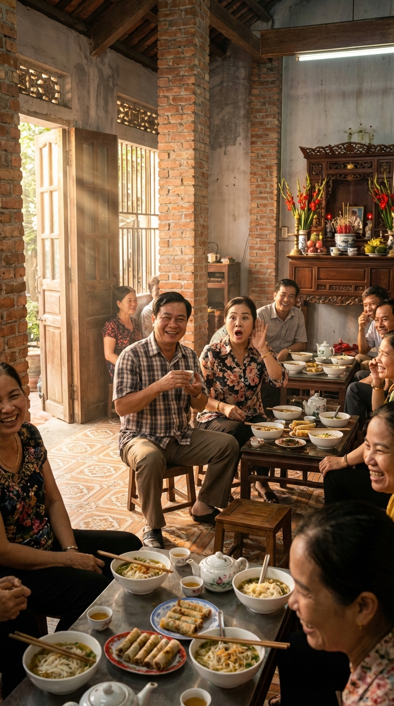 Giữa mùi nhang khói và tiếng lách tách của bát đĩa, chị Lan – người chị họ lấy chồng giàu ở tỉnh, vốn nổi tiếng là “loa phóng thanh” của dòng họ – tiến về phía tôi. Chị đeo một chiếc nhẫn kim cương to bản, tay cầm ly rượu vang đỏ, giọng oang oang: