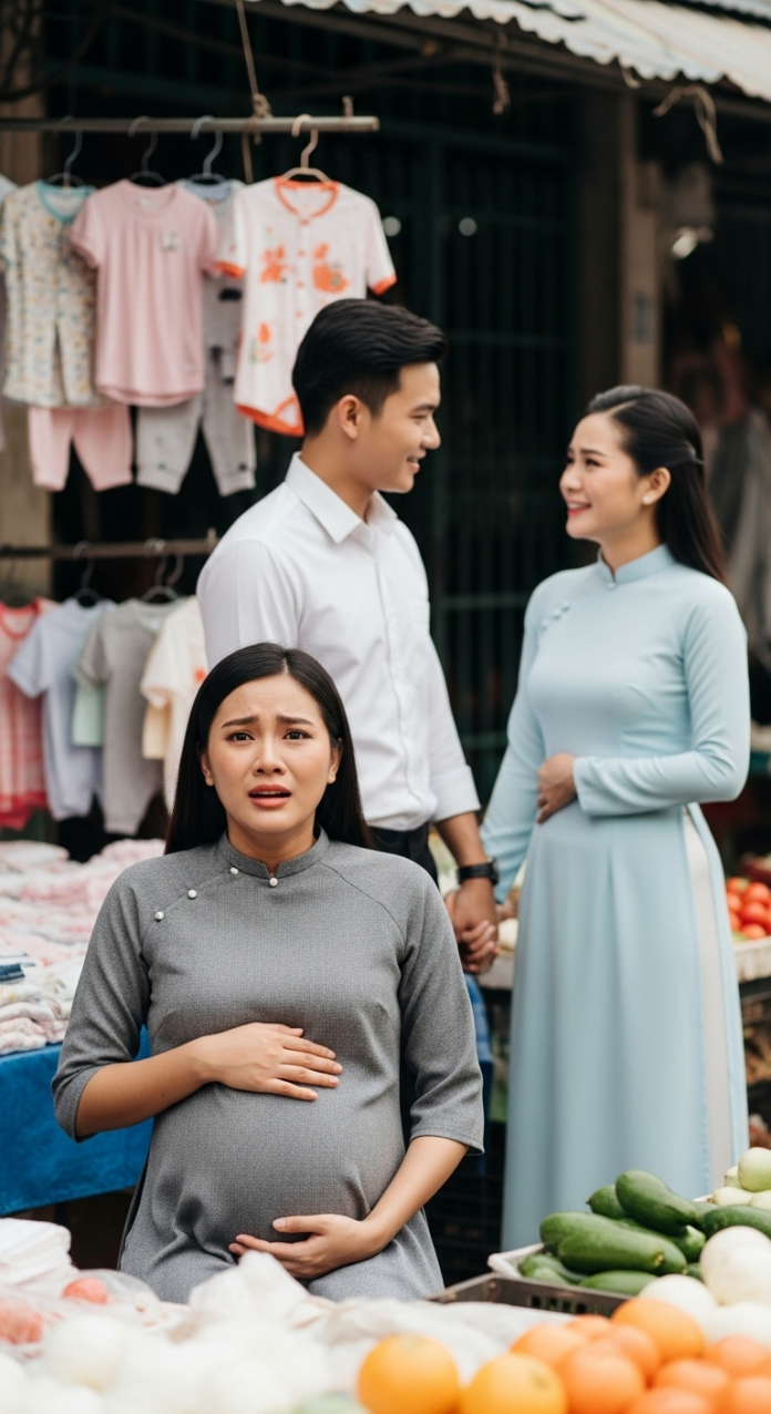 Hương đứng chết trân như hóa đá. Cô không dám bước tới. Chỉ nhìn từ xa, đủ để thấy rõ cái dáng thân thuộc của người chồng đầu ấp tay gối, giờ đây đang dịu dàng chăm chút cho một người đàn bà khác – trong khi vợ sắp sinh lại phải tự đi chợ một mình.