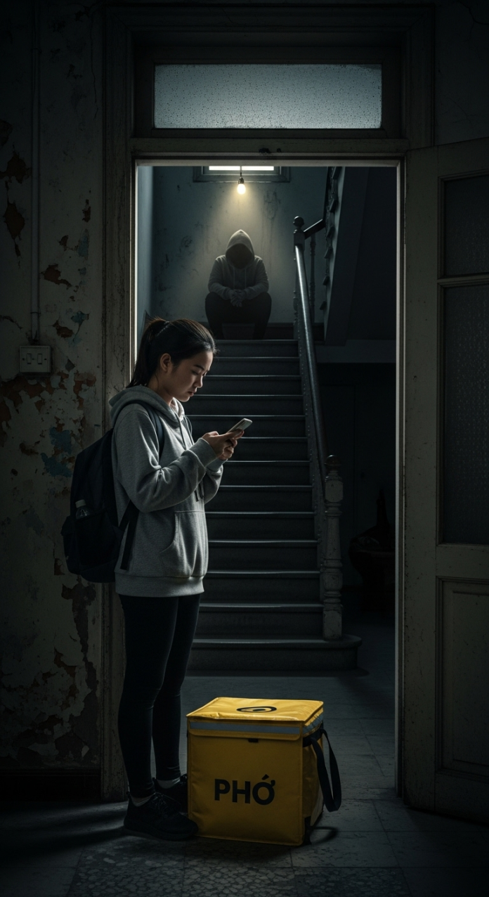 Shipper: “Là một người đàn ông, đội mũ trùm đầu, đứng nấp ngay chỗ rẽ tầng ba. Anh vừa định đi lên thì thấy hắn cầm vật gì đó như con dao, nên dừng lại. Em khóa cửa kỹ vào đi!”