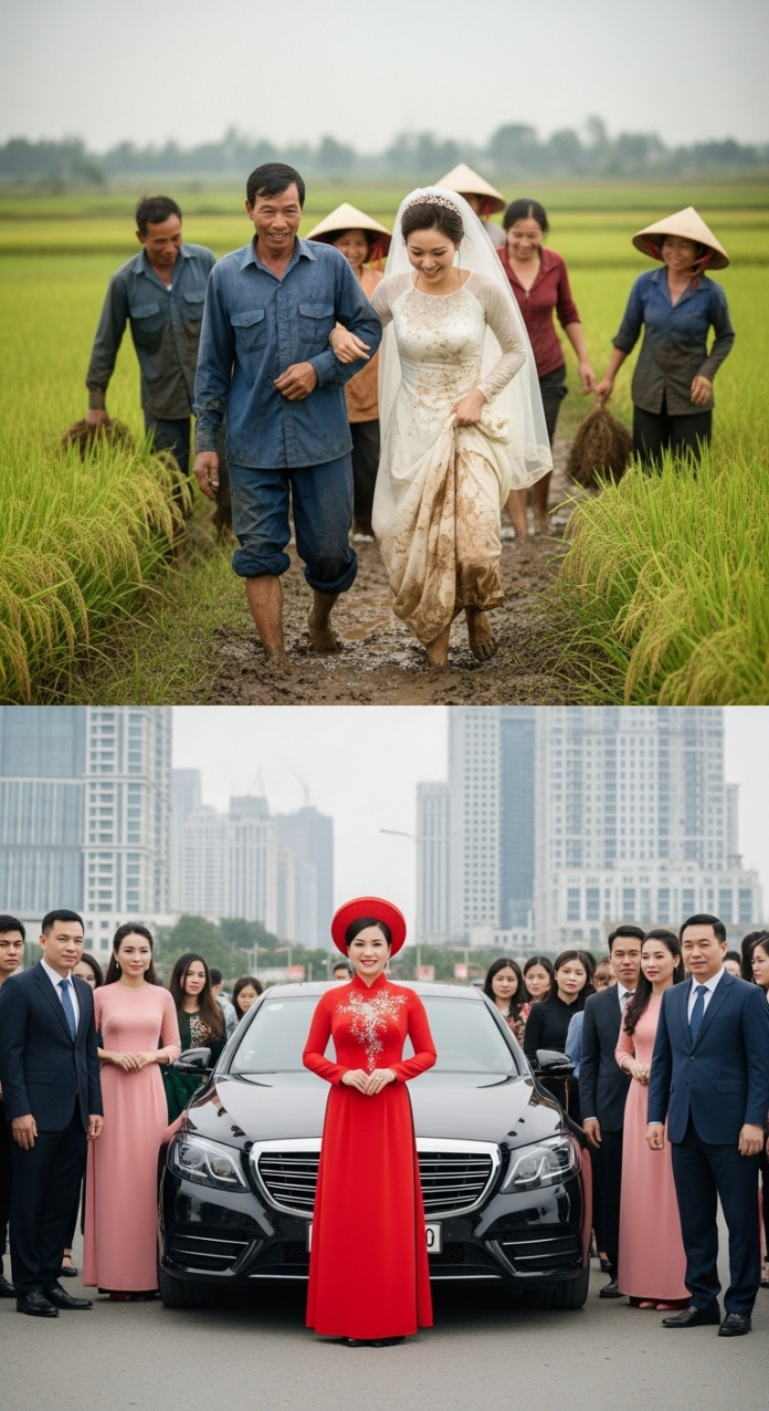 Thế là cô dâu trong bộ váy trắng, chân lấm bùn vì đường làng ẩm ướt sau cơn mưa đêm qua, cùng cha dắt nhau ra con đường lớn, nơi đoàn rước dâu đậu sẵn. Nhưng khi vừa đến nơi, bà mẹ chồng — ăn mặc sang trọng, son phấn đậm — nheo mắt nhìn cô từ đầu đến chân, khẽ bĩu môi: