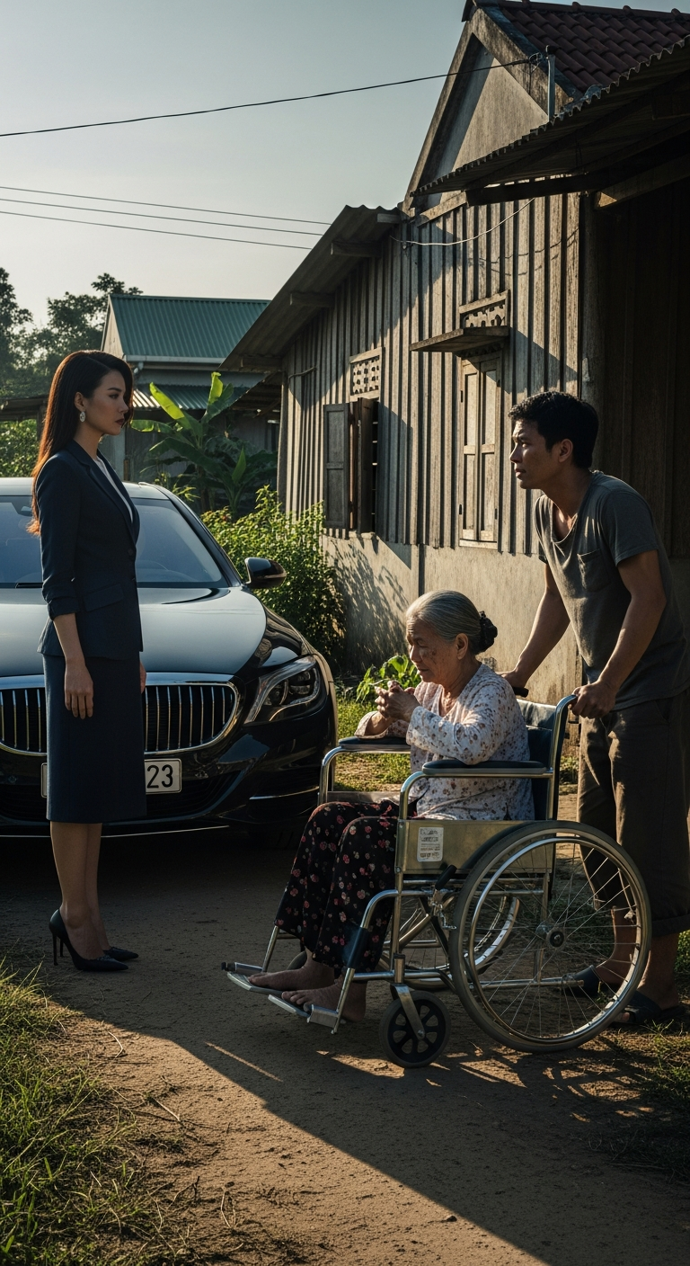 Ba ngày sau, chiếc xe hơi sang trọng trượt vào con đường làng đất đỏ. Chị bước xuống — váy hàng hiệu, nước hoa nồng nặc, ánh mắt soi mói nhìn quanh căn nhà vách nứa nơi mẹ nằm thoi thóp.