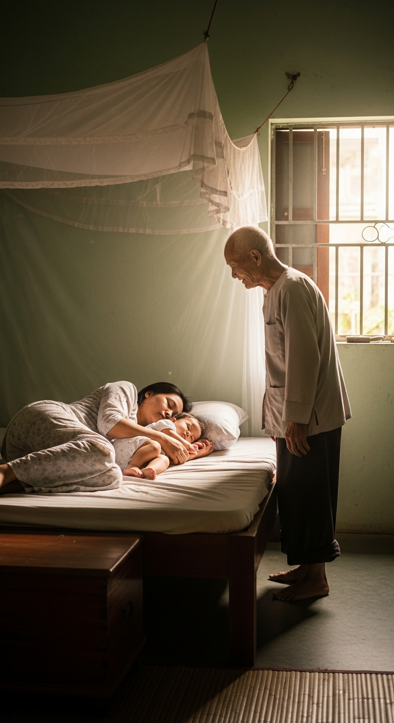 Ông tiến lại gần, nhẹ nhàng vén tấm chăn trên người con dâu. Hà My nắm chặt bàn tay, đầu óc căng thẳng không biết chuyện gì sẽ xảy ra. Nhưng ngay sau đó, cô cảm thấy có vật gì được đặt xuống chăn, rồi ông lặng lẽ quay đi, còn khép cửa rất khẽ.