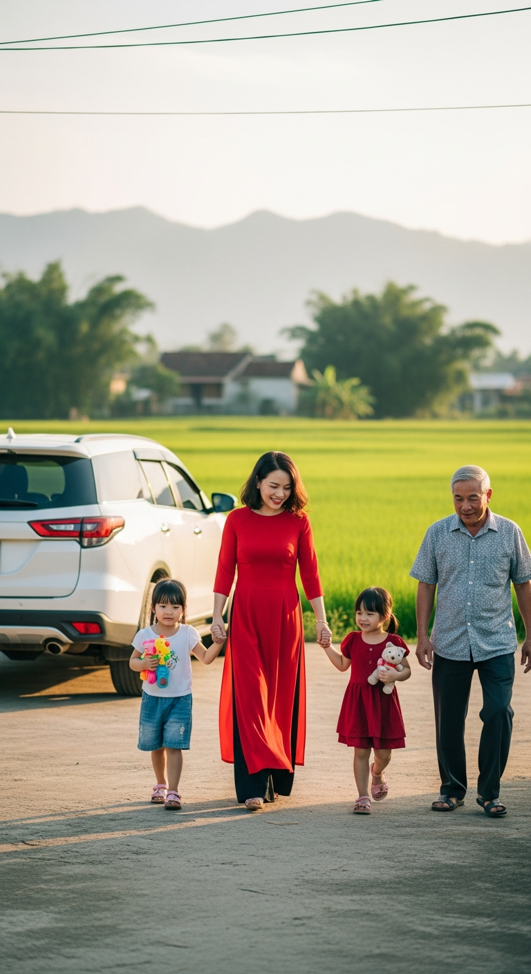 Đi bên cạnh anh là một cô gái trẻ ôm đứa bé tầm hai tuổi, tay dắt thêm một đứa lớn hơn.