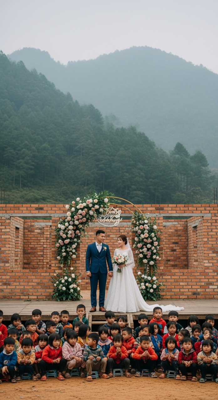 Hai tuần sau, đám cưới của họ diễn ra. Không phải ở sảnh tiệc sang trọng, mà là ngay tại sân ngôi trường Làng Sương vừa hoàn thành phần thô.