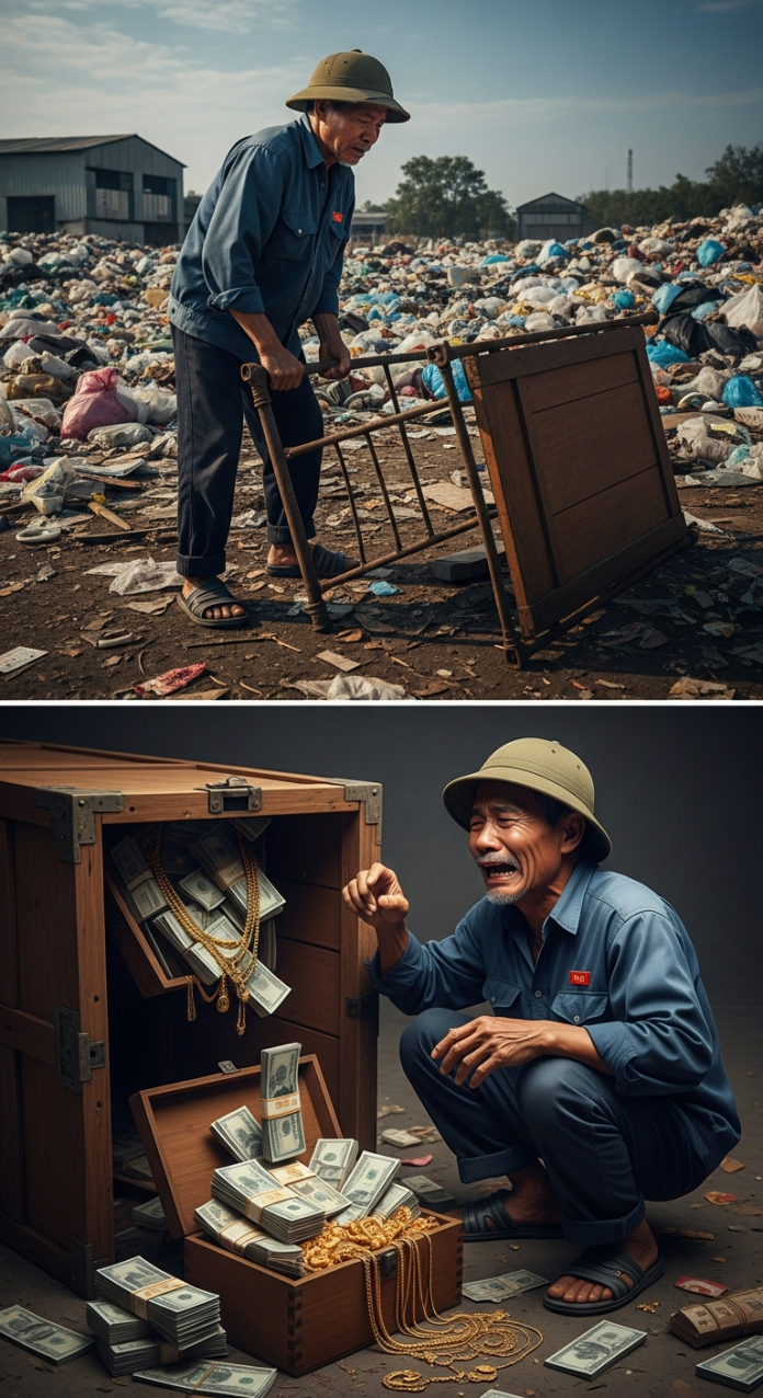 Ông chống lưng, cố gắng kéo chiếc giường ra khỏi đống rác. Nó nặng một cách kỳ lạ, như bên trong chứa đá. Ông nhíu mày, nhưng vẫn cố gồng, đưa nó lên chiếc xe đẩy cũ.