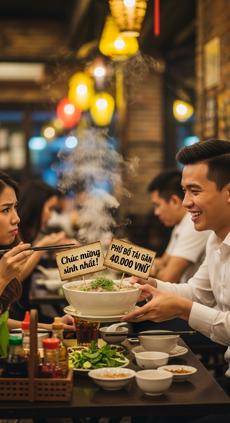 Quán đông, mùi nước lèo thơm lan trong không khí. Một bát phở 40 nghìn—không phải điều gì tệ. Nhưng đó là sinh nhật tôi. Tôi đã mơ một chút gì khác. Một chút thôi.