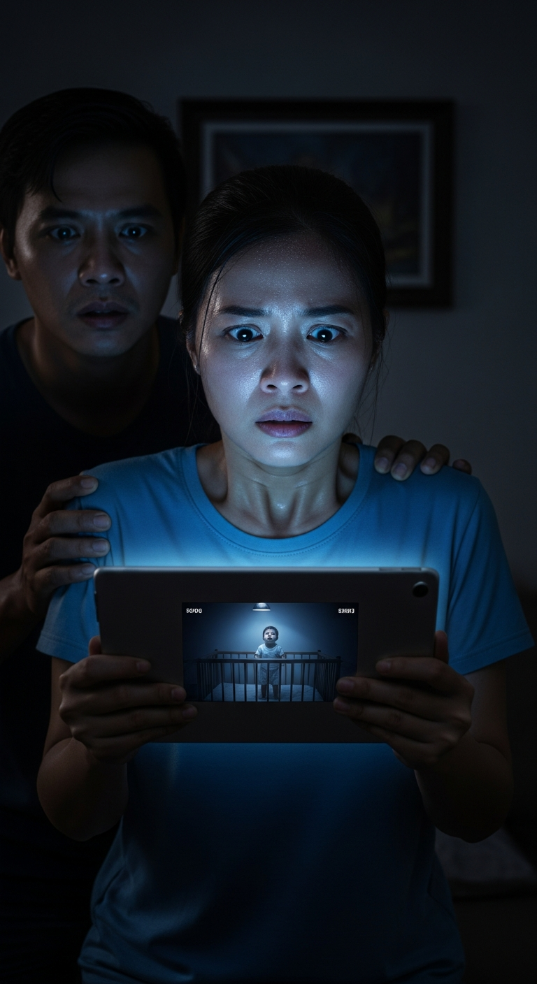 Gương mặt nó trắng bệch. Miệng mở hé như đang thì thầm với ai đó. Điều kinh hãi hơn là: căn phòng tối om, nhưng camera lại ghi nhận một vệt mờ hình người ở góc cạnh cửa sổ. Như bóng ai đó đang đứng, hoàn toàn bất động.