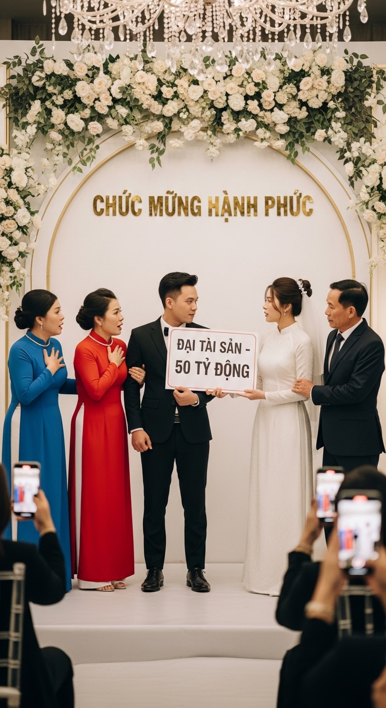 Tiếng bàn tán vang khắp hội trường. MC sững người. Cả hai họ đều kinh ngạc.
