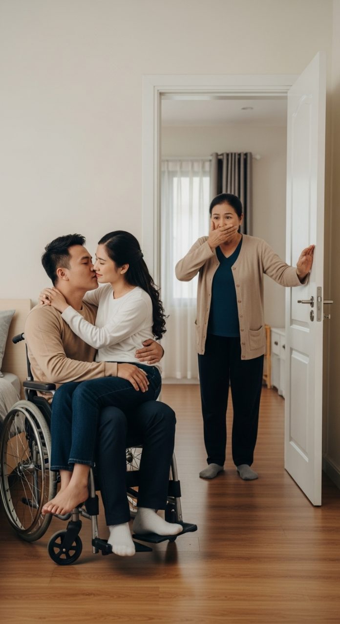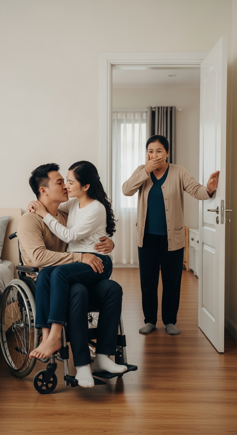 Trên giường, “ông chồng thực vật” của tôi đang ngồi dậy bình thường, tay ôm chặt một cô gái ngồi trên xe lăn, mặt áp sát vào nhau, hôn thắm thiết.