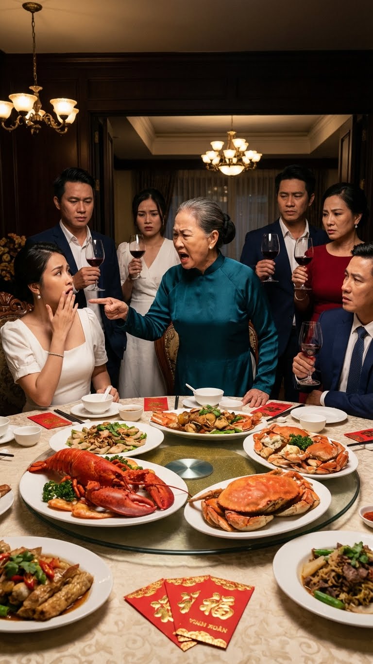 Nhà hàng họ chọn đúng kiểu sang chảnh: đèn vàng, nhạc nhẹ, bể hải sản lớn. Vừa ngồi xuống, mẹ chồng phẩy tay: