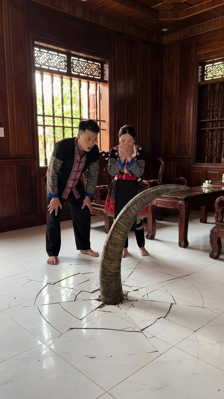 Đôi sừng trâu rơi khỏi tường, nứt vỡ đôi ngay trên nền đá hoa cương.
