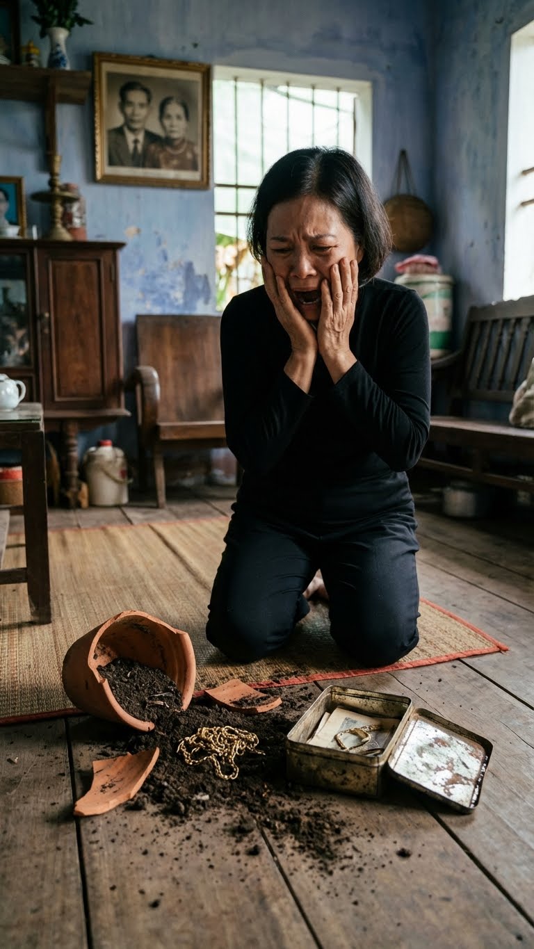 Chậu lan — kỷ vật duy nhất — vỡ nát thành từng mảnh.