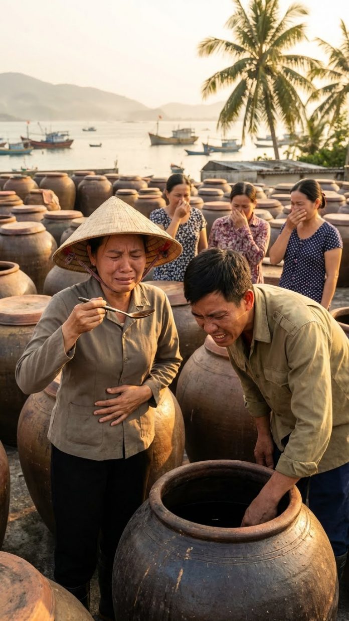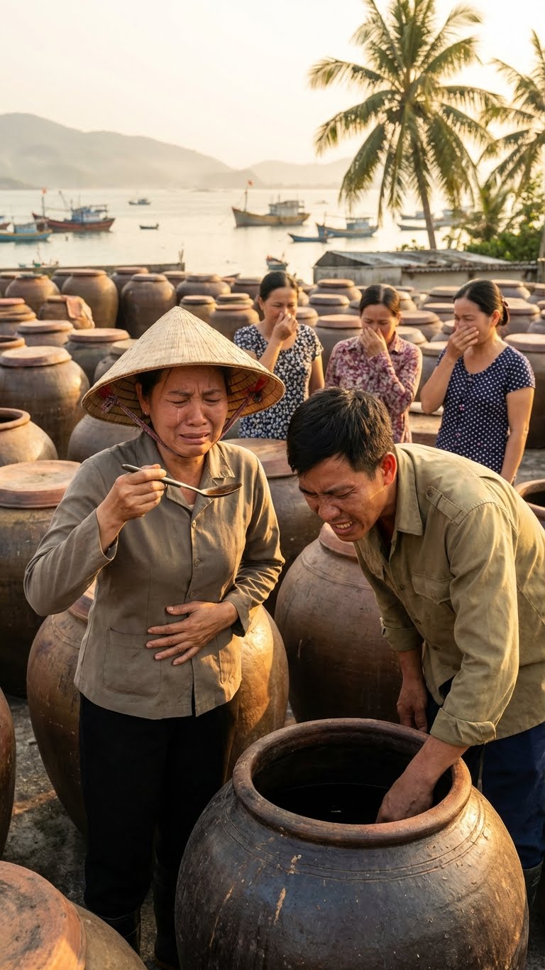 Toàn bộ 100 chum mắm tôm trong nhà—bốc mùi thối, nổi váng trắng xóa.