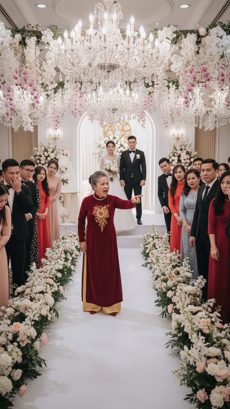 – “Hôm nay… là ngày vui của con trai tôi.” Bà ngưng lại, hít một hơi thật sâu, lồng ngực phập phồng dữ dội dưới lớp áo nhung. “Nhưng…”