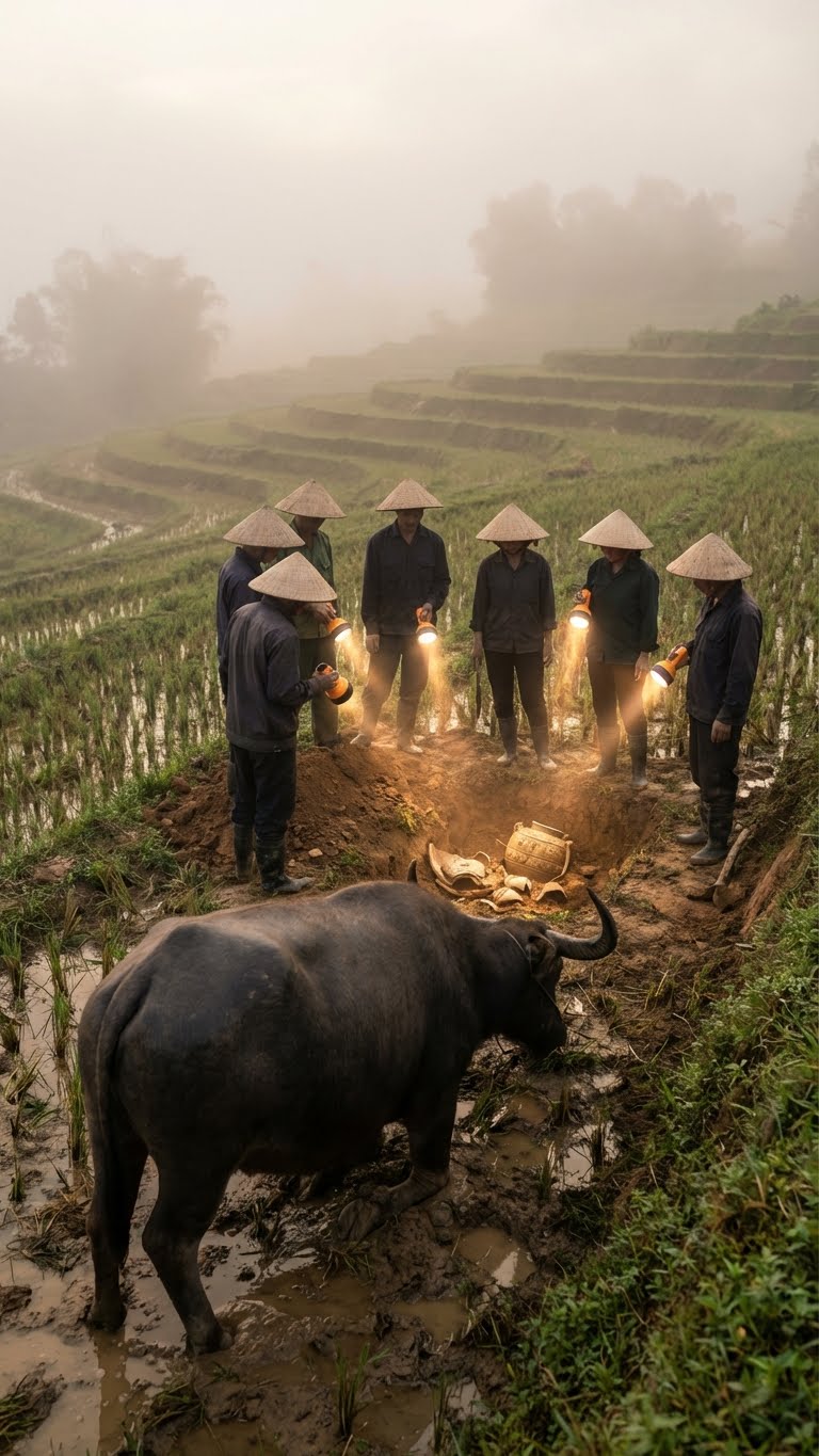 Khi tôi chạy tới nơi, trước mắt là một cảnh tượng hãi hùng: ngay đúng vị trí con trâu quỳ tối qua, đất bị tụt xuống thành một hố sâu đến 5–6 mét, rộng chừng vài chục mét vuông.