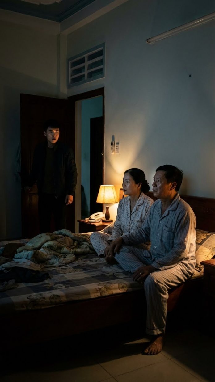 Ra đến phòng, tôi nghe qua cánh cửa tiếng bố đếm: “Một, hai, ba…” Rồi giọng Mĩm: “Bố thở sâu nhé.” Một lúc lại nghe tiếng gỗ cọ vào nhau, “roạt” một cái, rồi tiếng băng dính xé. Đèn phòng chỉ hắt ra chút sáng mỏng ở chân cửa — kiểu ánh sáng người ta vẫn dùng khi xem phim, hoặc có điều gì không muốn ai biết.
