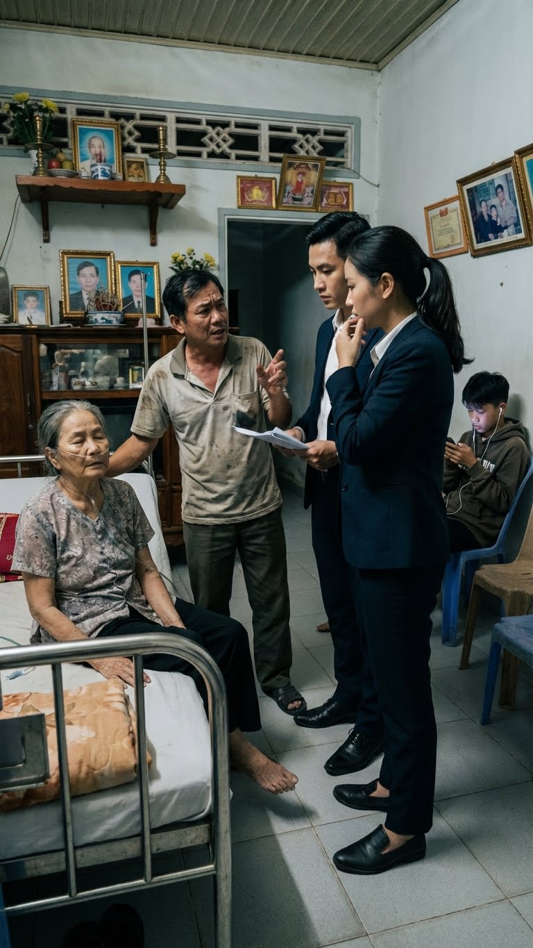 Mẹ chồng nằm trên giường. Bà mở mắt nhìn con trai. Gương mặt bà không có giọt nước mắt nào nhưng run theo nhịp thở.