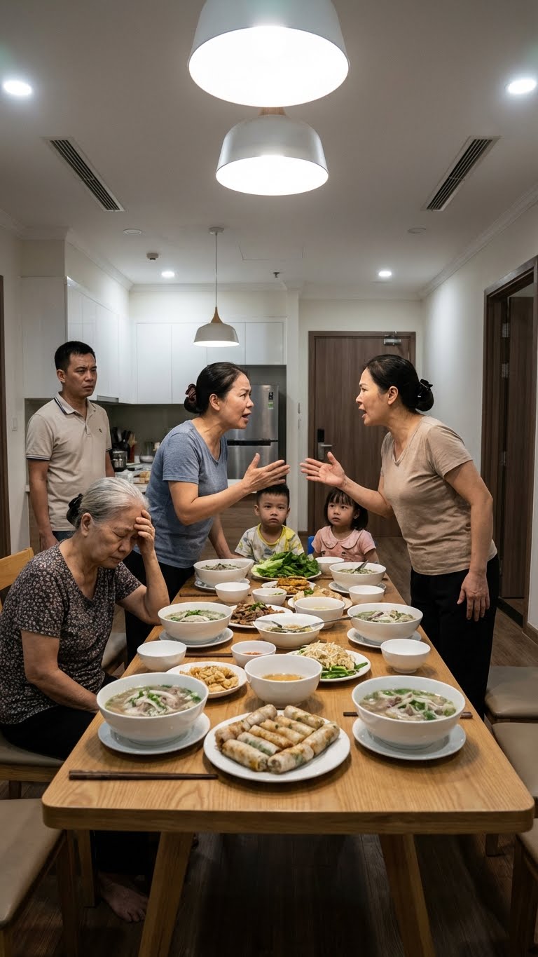 Chi, với vẻ ngoài kiệt sức vì công việc và chăm con, đặt cốc nước cam lên bàn. Ánh mắt cô sắc lạnh, xoáy sâu vào mẹ mình. “Mẹ, con đã nói bao nhiêu lần rồi? Đừng có lén lút ăn uống vớ vẩn ngoài kia! Mẹ đã tăng ba ký rồi đấy! Mẹ nghĩ con vất vả nuôi mẹ là để mẹ cứ mặc sức nuông chiều bản thân, không giữ gìn sức khoẻ sao? Hay mẹ nghĩ con giàu có, thừa tiền cho mẹ ăn thả phanh?” Giọng Chi đầy vẻ mỉa mai chua chát, không che giấu sự khó chịu. Cô đang ám chỉ những buổi tối muộn mẹ cô viện cớ đi dạo mát để tìm kiếm một sự an ủi khác.