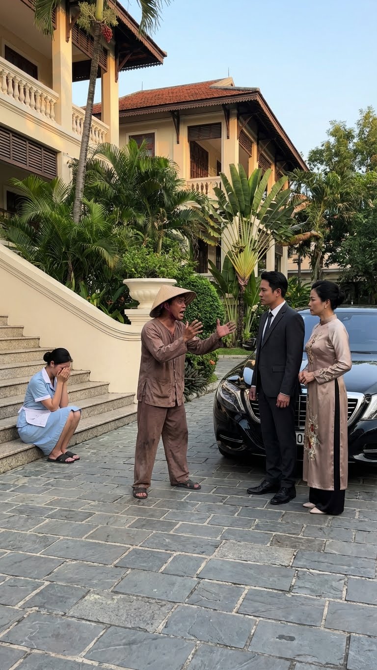 Ông Hùng từ trong nhà bước ra, vẻ mặt nghiêm nghị nhưng vẫn giữ được sự bình tĩnh của một người từng trải. Ông mặc bộ vest lịch lãm, phong thái uy nghi.