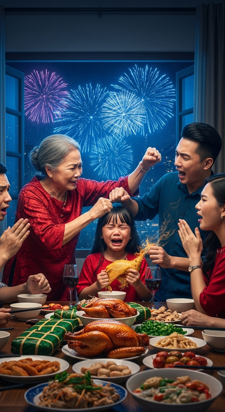 Không khí Tết tan biến trong tích tắc. Ngoài sân, pháo hoa giao thừa bắt đầu nổ rộ, còn trong nhà, tôi nhìn con gái khóc nấc trong tay mẹ nó mà cảm giác như có thứ gì đó vừa vỡ toang. Đêm giao thừa, đáng lẽ phải là đoàn tụ, lại mở đầu bằng một cái tát không ai ngờ tới.