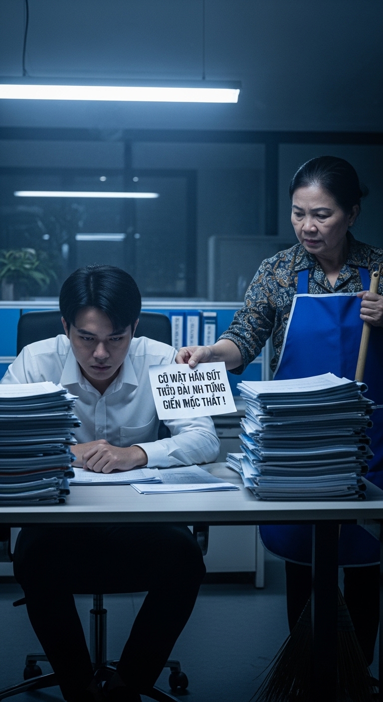 Đúng lúc đó, từ bóng tối bên hông kho, cô Hạnh xuất hiện. Cô không đẩy xe lau sàn như thường lệ, mà đứng nép sát tường, ánh mắt đầy lo lắng. Khi ánh đèn chiếu rõ gương mặt cô, tôi mới thấy rõ những nếp nhăn hằn sâu, đôi mắt thâm quầng vì thiếu ngủ.