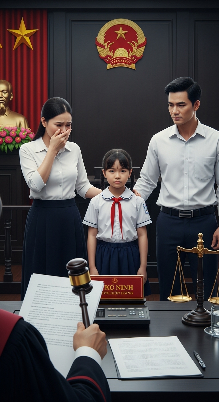 Thẩm phán gõ nhẹ búa, quay sang bé Minh Anh: “Con có muốn nói điều gì không? Con muốn ở với ai?”
