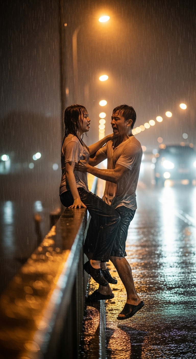 Tôi nghiến răng, dồn hết sức ép người vào lan can, kéo cô ấy sát lại. “Nếu em muốn chết, ít nhất… nhìn xem anh đang cố thế nào để em sống!” Tôi thở dốc, nước mưa lẫn nước mắt mặn chát.