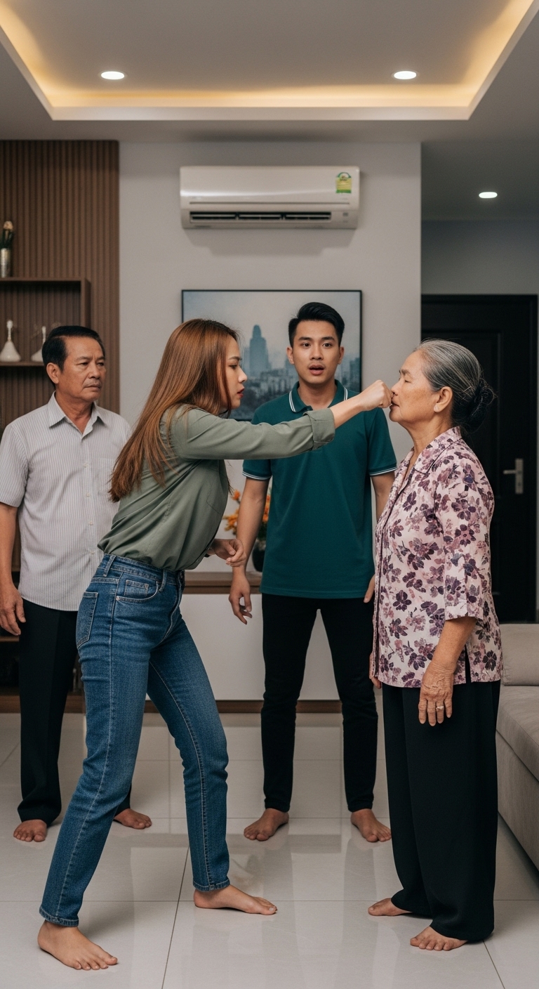 Tôi không nghe nổi nữa. Một tiếng “chát” vang lên, bàn tay tôi giáng thẳng vào má bà. Căn phòng im phăng phắc. Tôi thở dốc, mắt cay xè. Hưng đứng bật dậy, nhìn tôi như không tin.