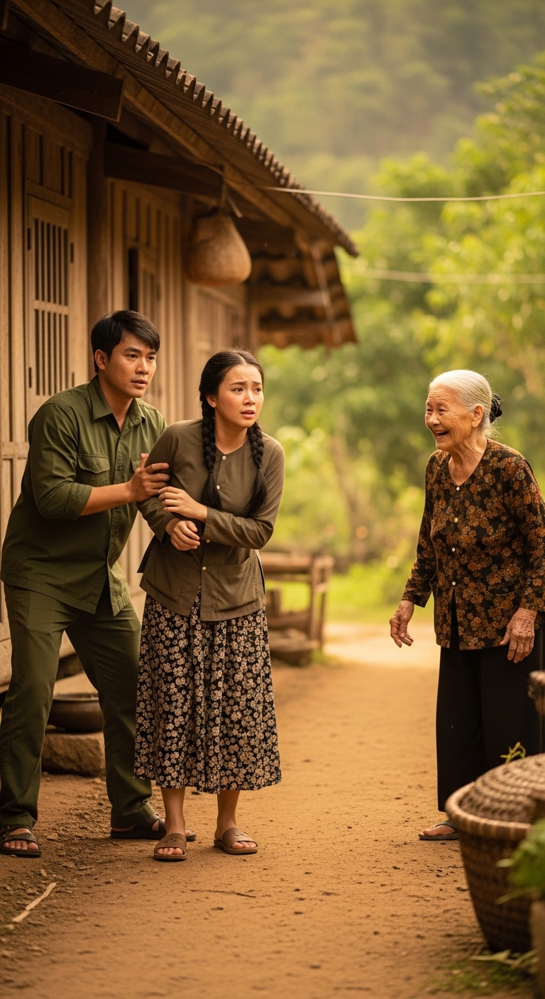 Huy liếc mẹ. Bà Lệ đứng thẳng, vai hơi rung vì tức, nhưng vẫn cố giữ thể diện trước hàng xóm. Bà tin mình đúng, tin rằng “dạy” con dâu là chuyện nội bộ. Bà nhìn Huy như ra lệnh: “Nói đi.”