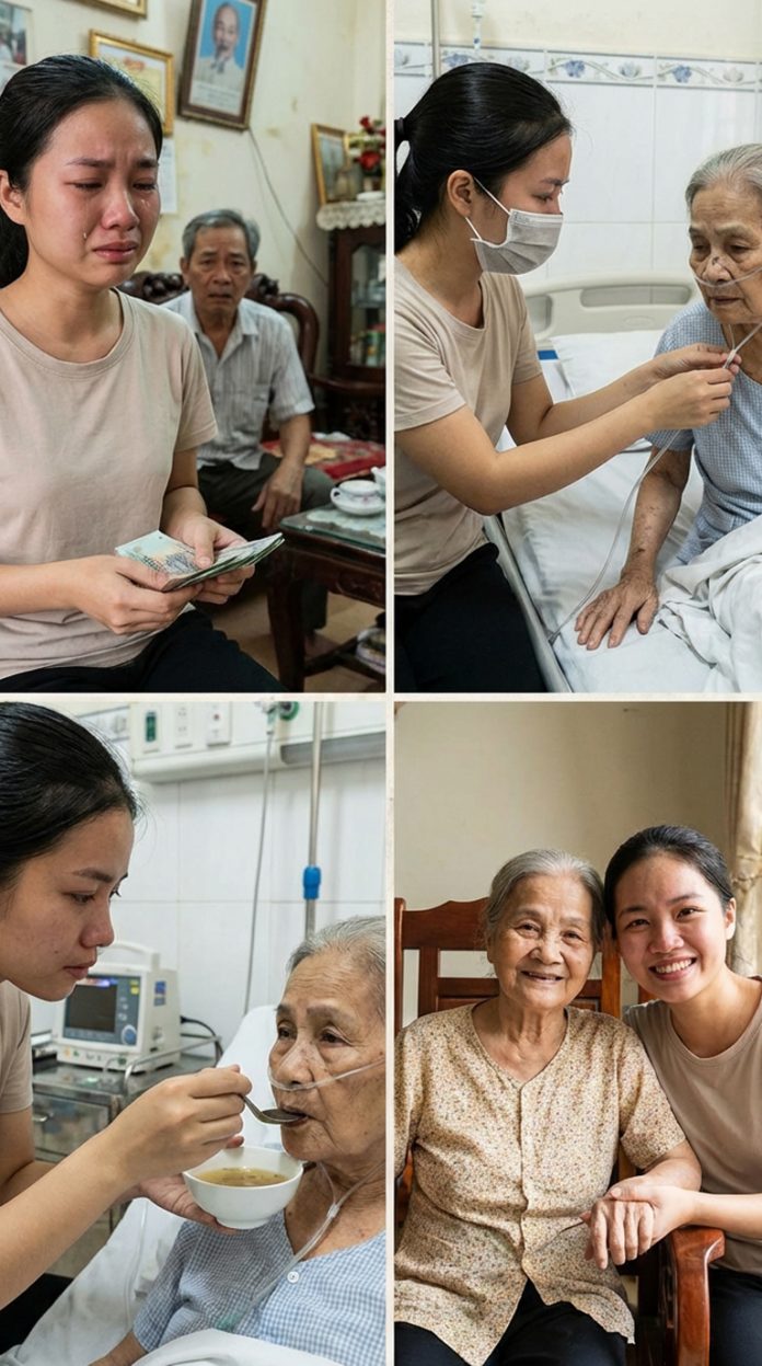 Lời anh như một nhát dao cắt ngang tim tôi. Tôi im lặng, mắt nhoè lệ, nhưng trong lòng quyết tâm: mẹ tôi cần tôi. Tôi nhặt số tiền tiết kiệm, vài đồng từ tiền lương và tiền dự phòng, gom đủ 120 triệu. Không cần ai biết, tôi đưa cho bác sĩ. Mẹ được mổ kịp thời. Tôi thấy mẹ nằm trên giường bệnh, ánh mắt yếu ớt nhưng yên lòng khi nhìn tôi. Một phần hạnh phúc, một phần cô đơn trào dâng.