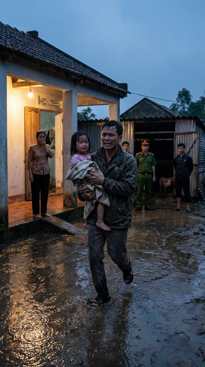 Cổ họng anh nghẹn lại. Anh cởi áo khoác bọc con, nhìn quanh thấy một sợi dây buộc cổng chuồng, dấu chân nhỏ in sát vũng nước. Anh bế Lan vào nhà, đặt con lên ghế, lấy khăn lau mặt. Bé rụt rè, như sợ bị mắng.