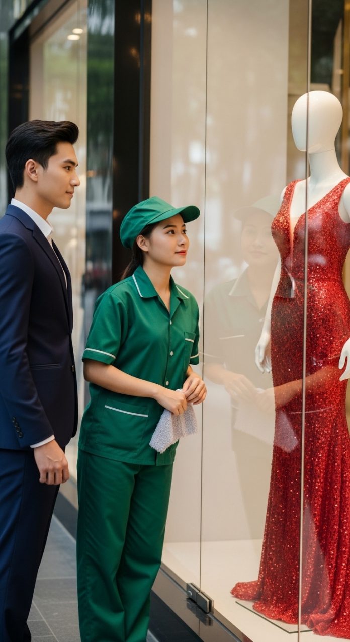 Đi ngang qua khu trưng bày thời trang cao cấp, Hùng bỗng khựng lại. Trước tủ kính trưng bày bộ sưu tập mới nhất, có một người phụ nữ đang đứng. Cô ta mặc bộ đồ màu xám tro giản dị, trông chẳng khác nào đồng phục của nhân viên tạp vụ, tay đang cầm chiếc khăn lau chăm chú nhìn vào bên trong.