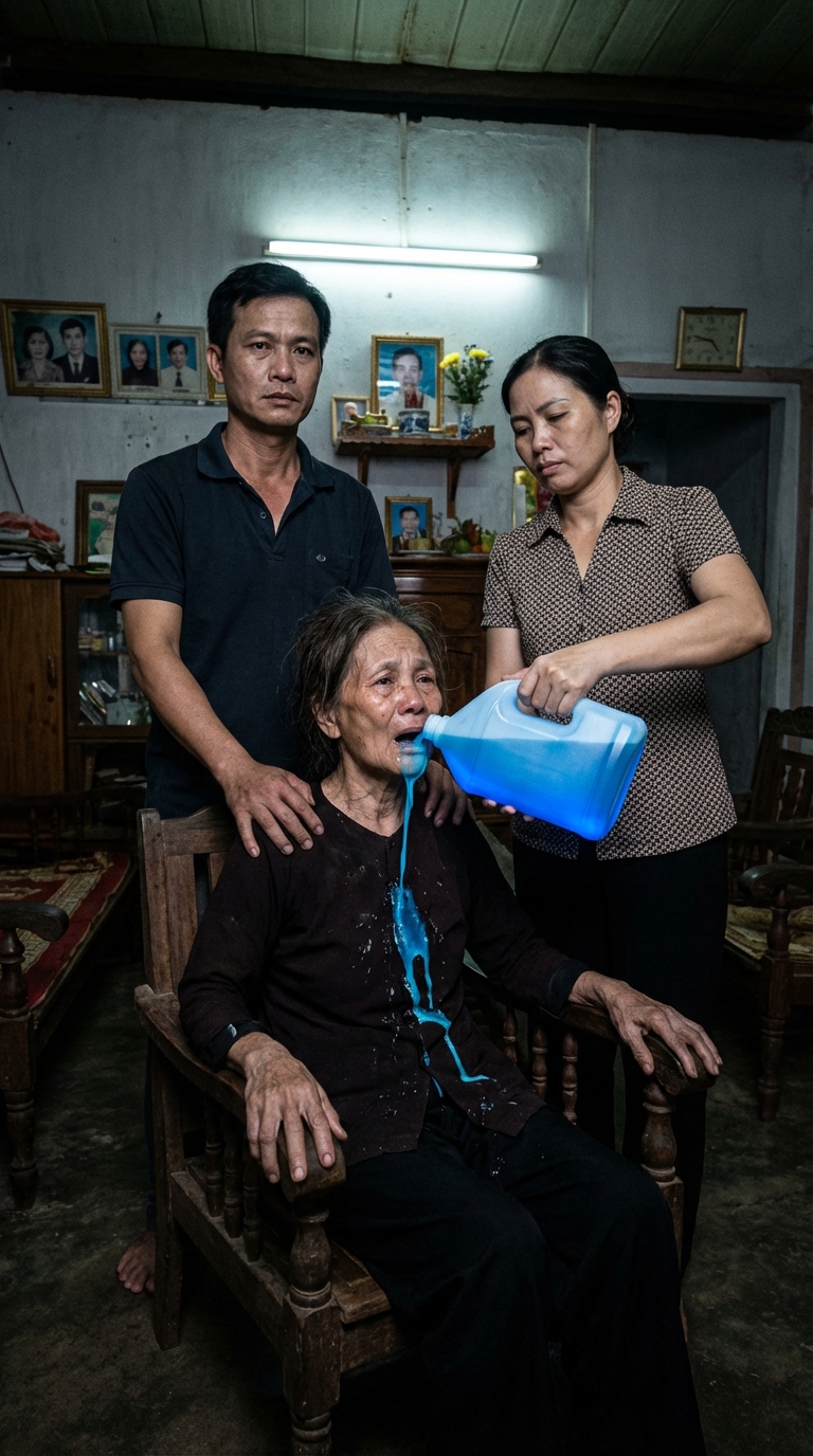 “Uống đi, bà già vô dụng! Rụng sạch sẽ đi!” Lan gằn giọng, rồi thành bột, đổ dòng nước muối lạnh vào miệng bà.