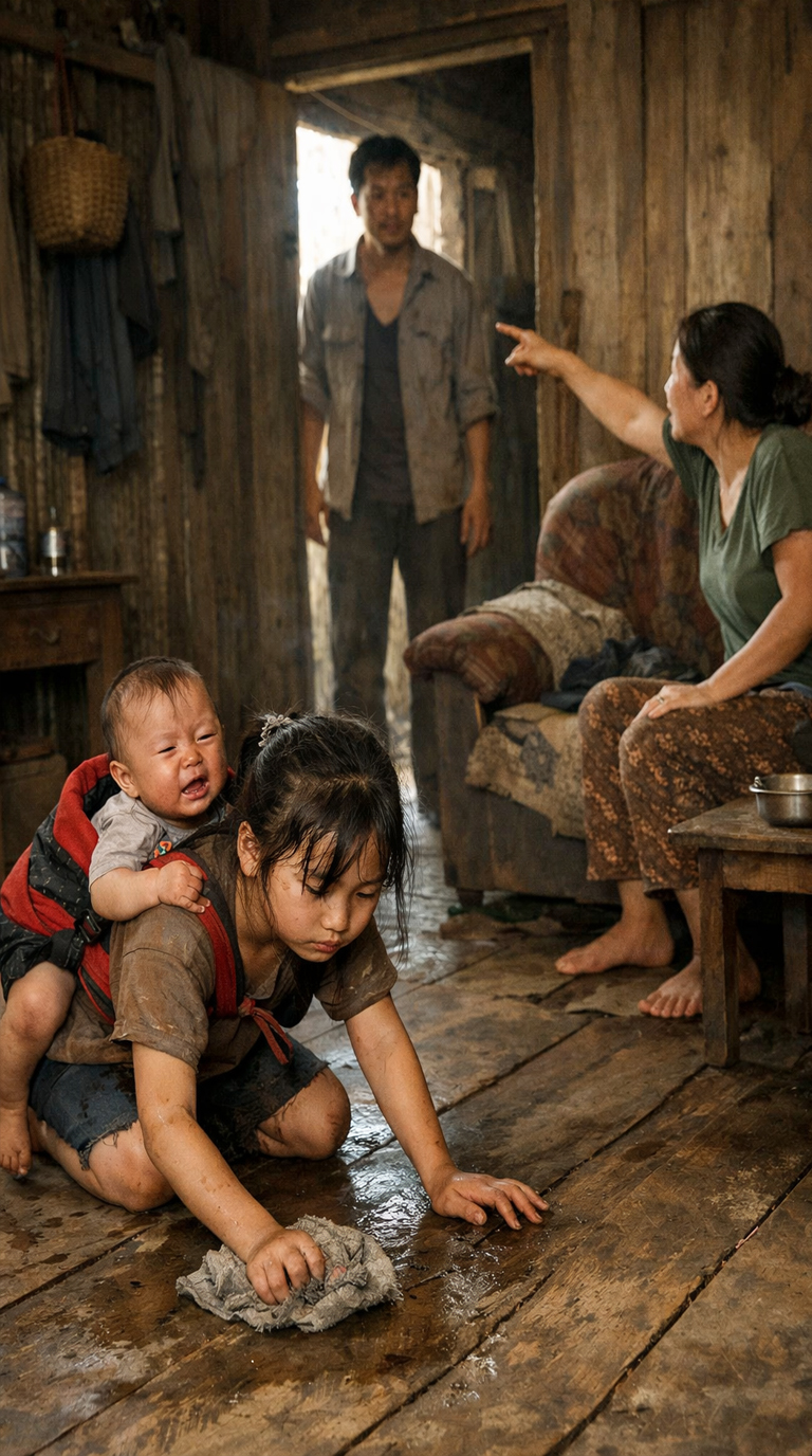 Con gái tôi — tám tuổi — đang quỳ xuống lau sàn. Trên lưng nó cõng em trai mới hai tuổi. Thằng bé ngủ gục, đầu gục vào vai chị. Hai tay con bé run run, nhưng vẫn cố lau cho sạch từng vệt nước.
