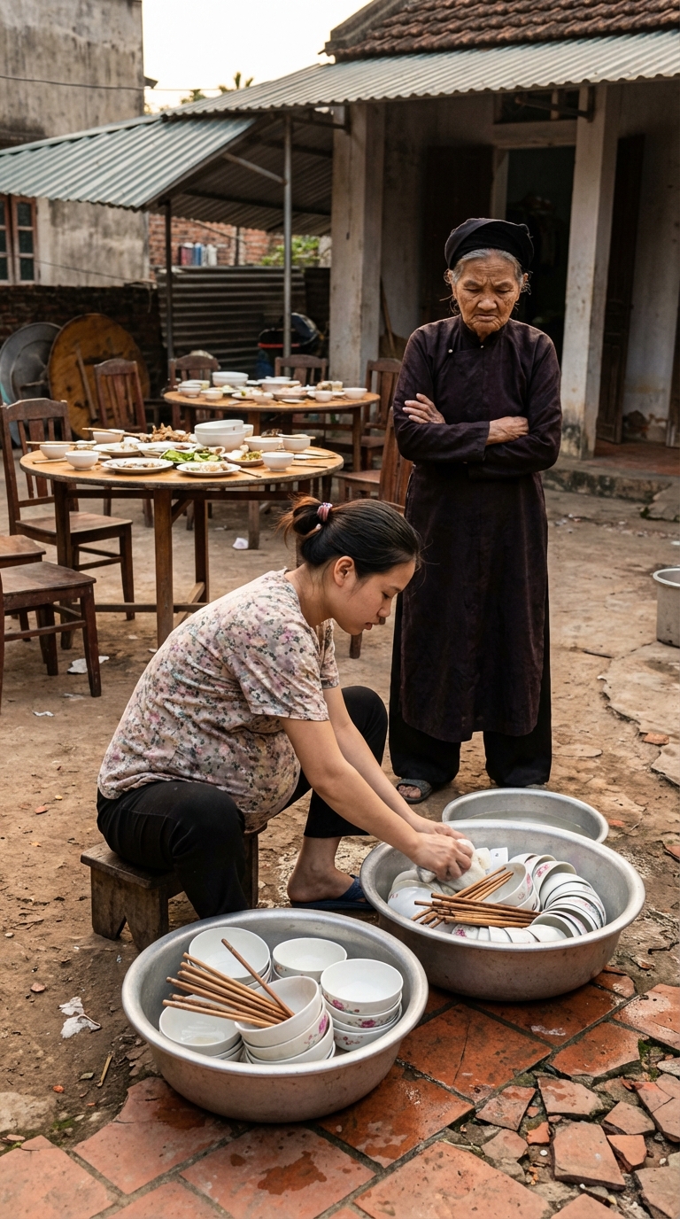 – Dậy rồi đấy à? – Giọng bà khàn đục, lạnh lẽo. – Hôm nay 30 mâm, liệu mà làm cho khéo. Đừng để người ta cười vào mặt cái nhà này là rước về một đứa con dâu vụng thối vụng nát.