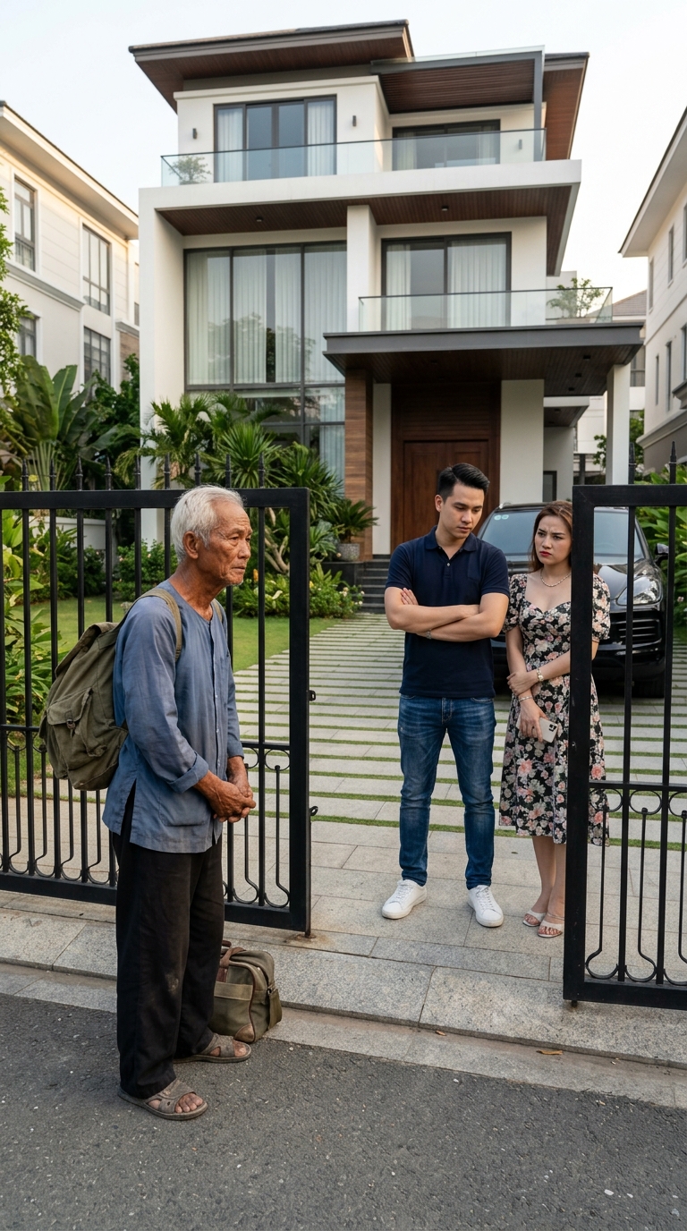 Ông Trung đứng trước căn nhà 4 tầng khang trang của Quân ở một khu đô thị mới. Cổng sắt cao, xe hơi đậu kín sân. Ông chỉnh lại chiếc áo sờn vai, hít một hơi rồi bấm chuông.