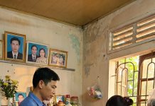 Căn phòng chỉ hơn mười mét vuông, nóng hầm hập. Một chiếc quạt cũ quay lạch cạch.