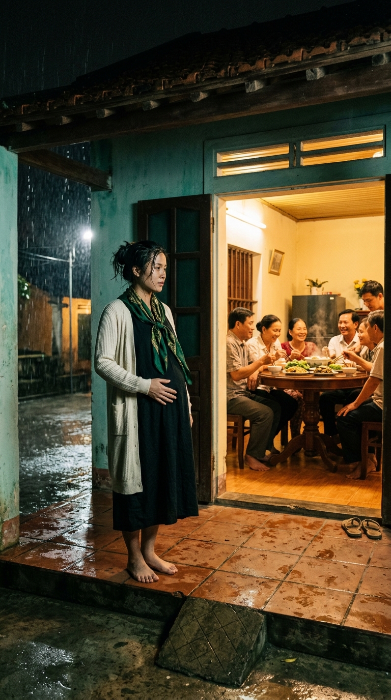 Bên trong, bà Hảo – mẹ chồng tôi – không trả lời ngay. Chỉ có tiếng dép lê qua lại, tiếng người nhà nói xì xào. Tôi nghe cả tiếng chồng mình, Hùng, nhỏ như lạc vào một tầng mưa khác: “Mẹ ơi… mở cho vợ con vào đi.”