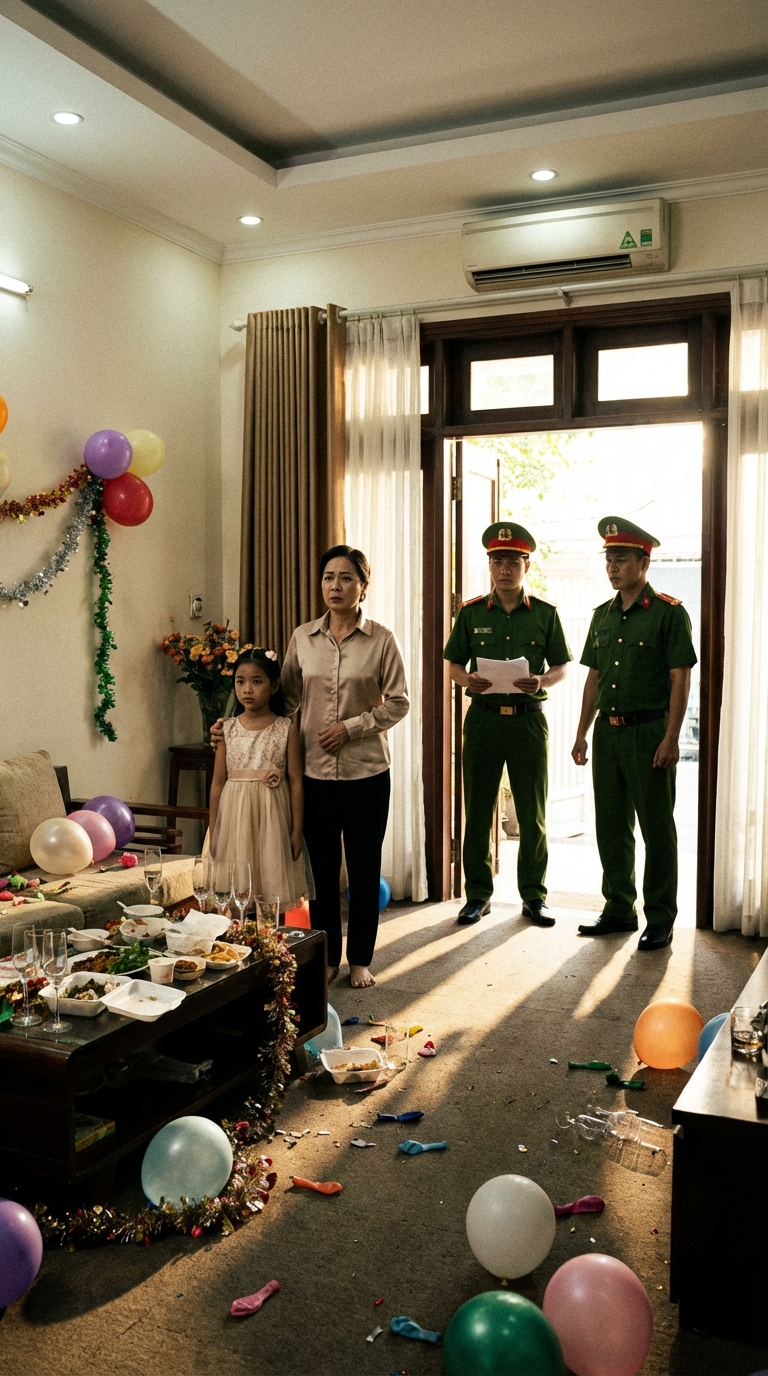 Chiếc bánh kem “mừng tự do” tối qua vẫn còn nguyên trên bàn. Lớp kem trắng bắt đầu chảy xuống, nhòe cả dòng chữ đỏ: “Chúc mừng con gái thoát nợ đời.”