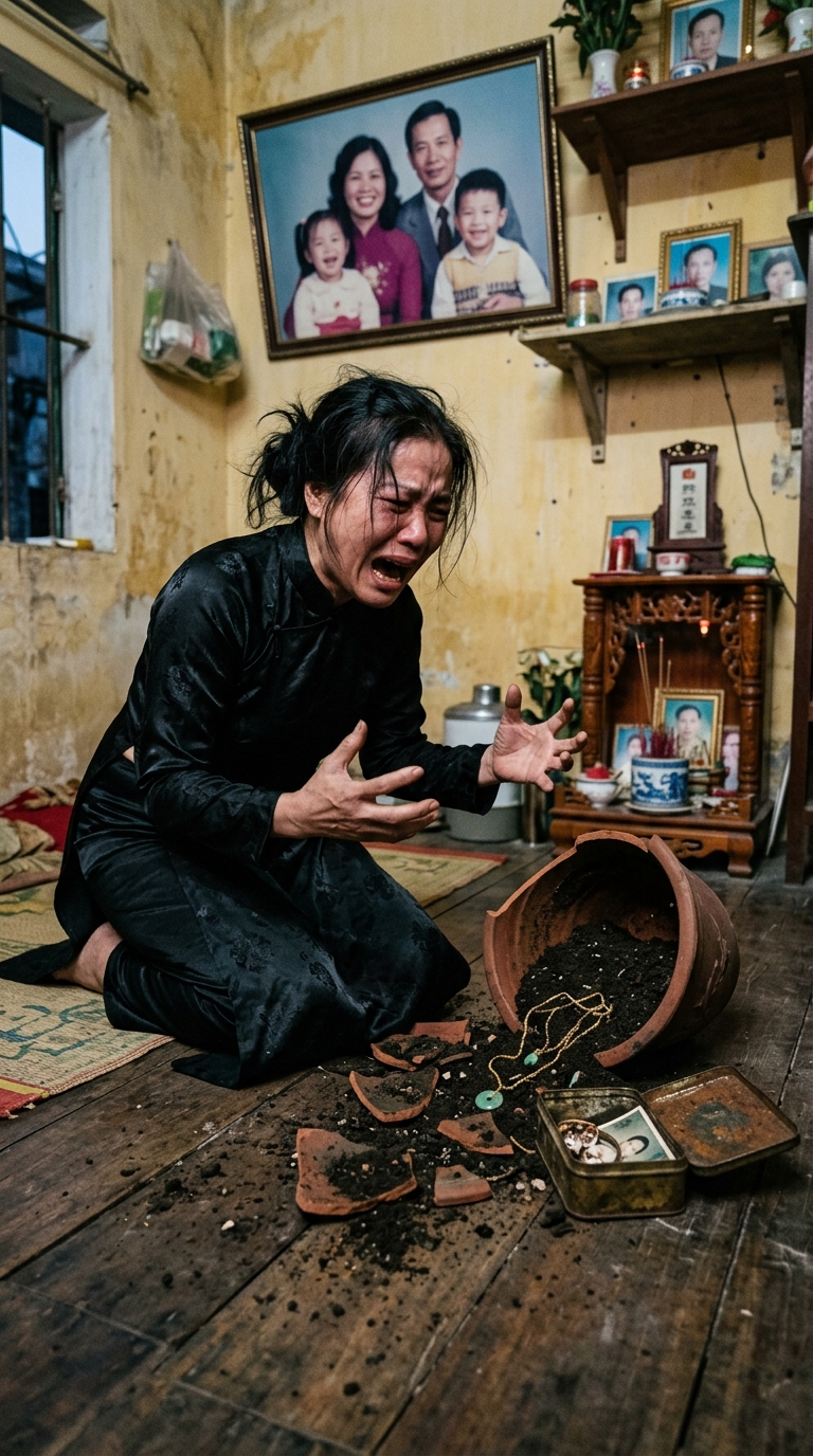 Chậu lan — kỷ vật duy nhất — vỡ nát thành từng mảnh.