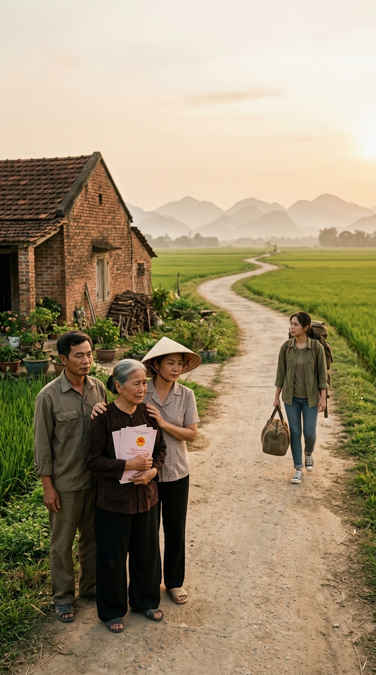 Một chiều tháng Hai, tôi đang phơi quần áo thì thấy ba anh em nhà chồng tụ tập trong phòng khách. Mẹ chồng đặt trước mặt mỗi người một xấp giấy đỏ. Tôi đoán ngay: sổ đỏ. Những mảnh đất bà tích góp cả đời.