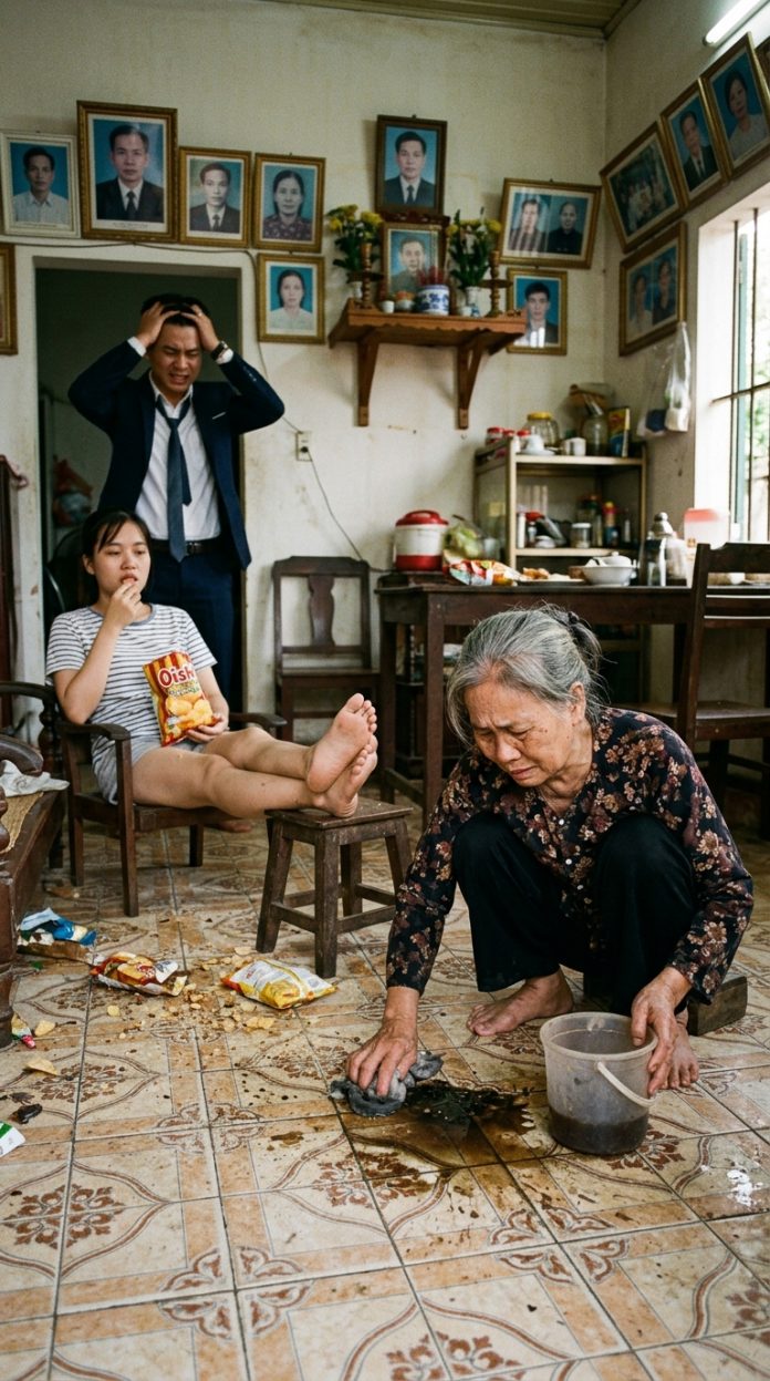 Nỗi nhục nhã ê chề dâng lên trong lòng, nhưng vì thương con, bà Lụa nuốt nước mắt vào trong. Bà lụi cụi lau từng kẽ gạch, đôi bàn tay gầy guộc run rẩy bê chậu nước nặng trĩu. Bà tự trấn an mình: “Chắc nó bận quá nên cáu gắt, mình làm giúp con tí việc có sao đâu”.